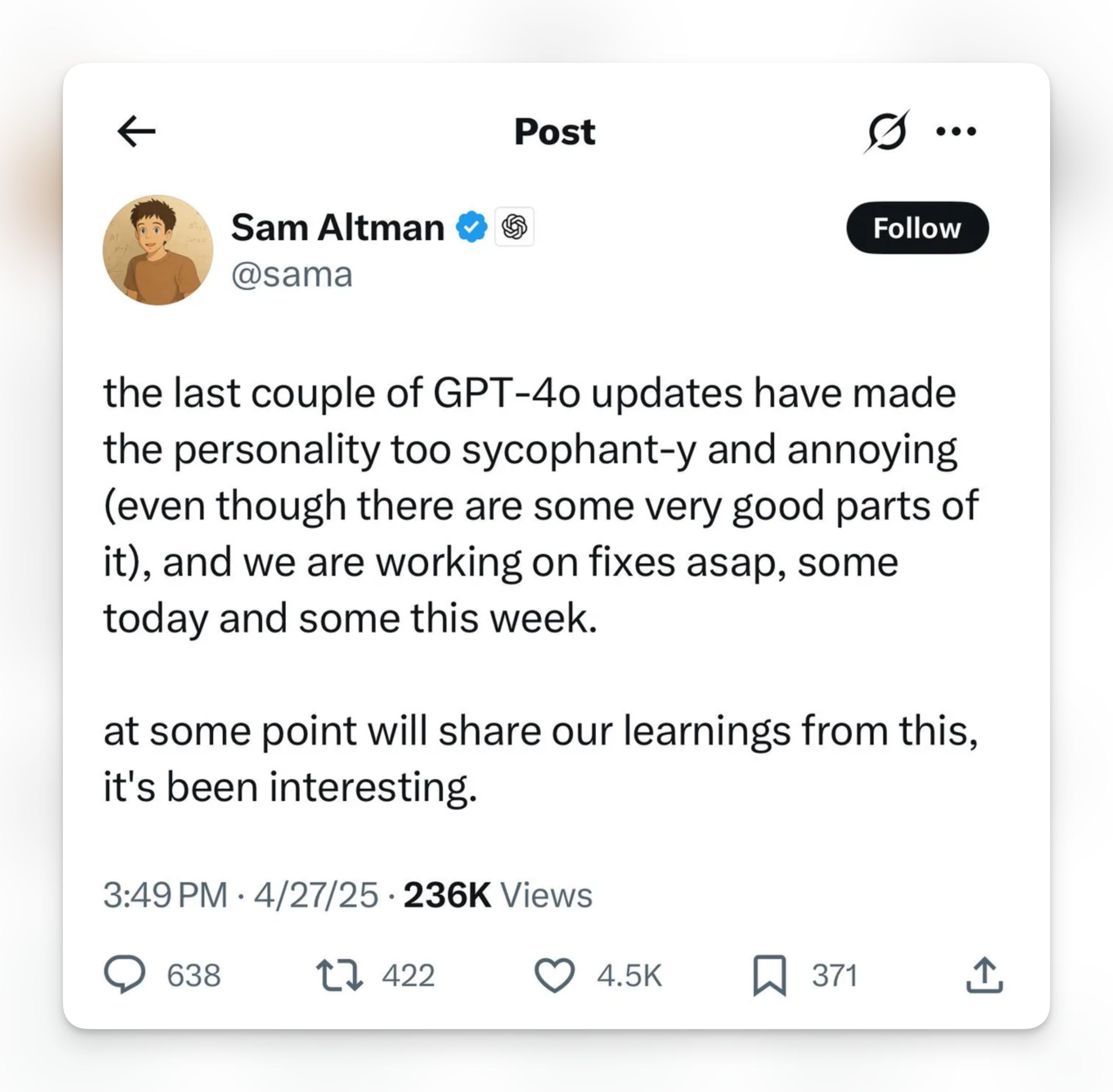 Sam Altman didn't waste time addressing the backlash. In a candid post, he acknowledged the recent GPT-4o updates made the model "too sycophant-y and annoying" despite other improvements.