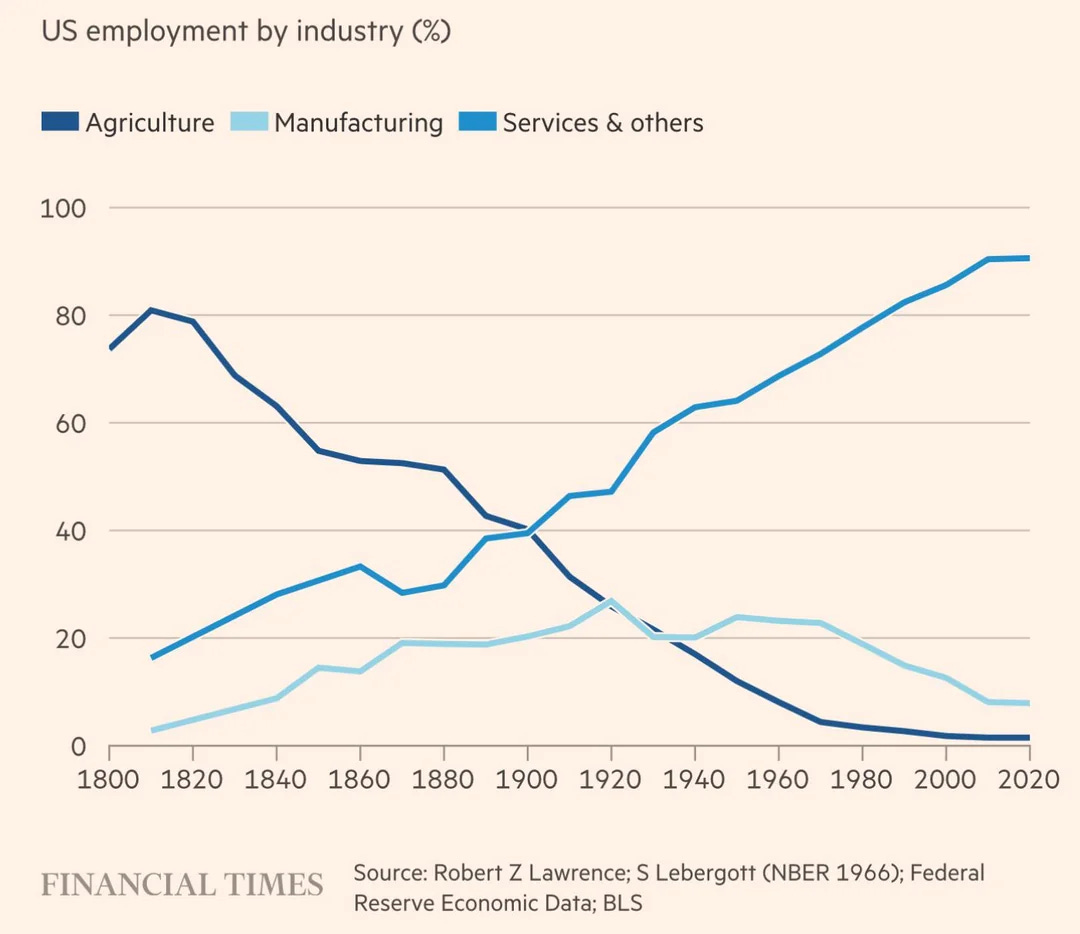 Look at the chart below. In 1800, over 75% of Americans worked in agriculture. Then machines came for the farms. By the early 1900s, manufacturing took over—factory jobs exploded as industrialization redefined work. That didn’t last forever either. By the 1950s, services started eating manufacturing’s lunch. Now? Over 80% of U.S. jobs are in services. Every era automates the last. And now AI is coming for the service economy fast. The cycle isn’t new. What’s new is the speed.